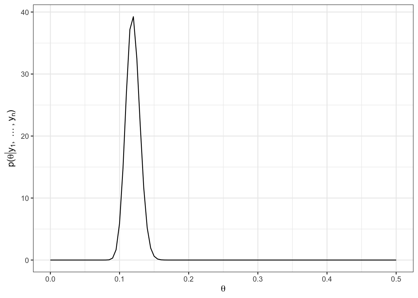 Given our prior of \(a = 9, b = 3\), \(E[\theta | y_1,\ldots, y_n] =\) 0.1194