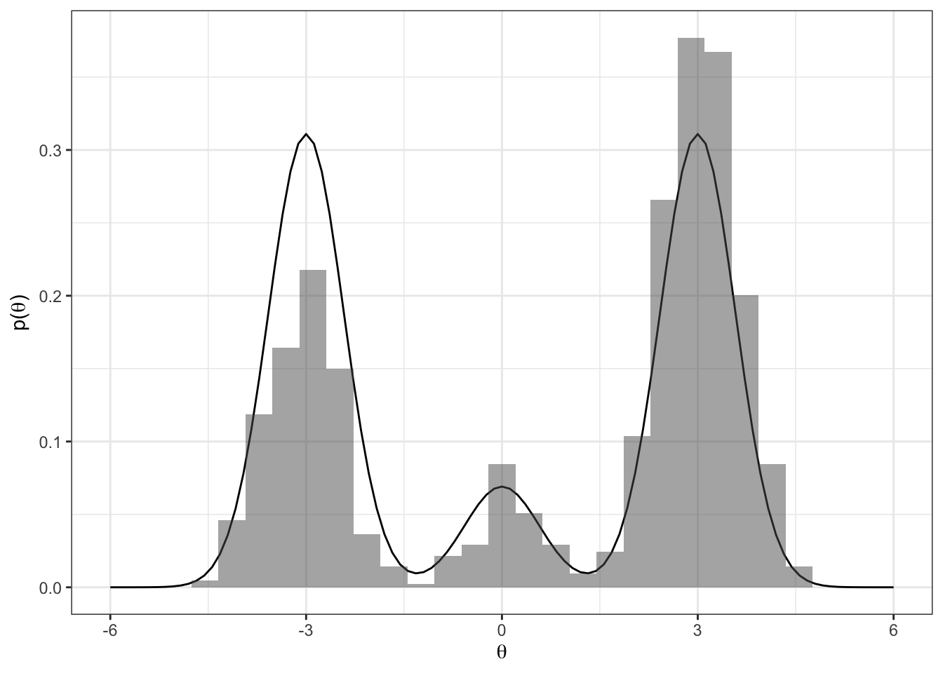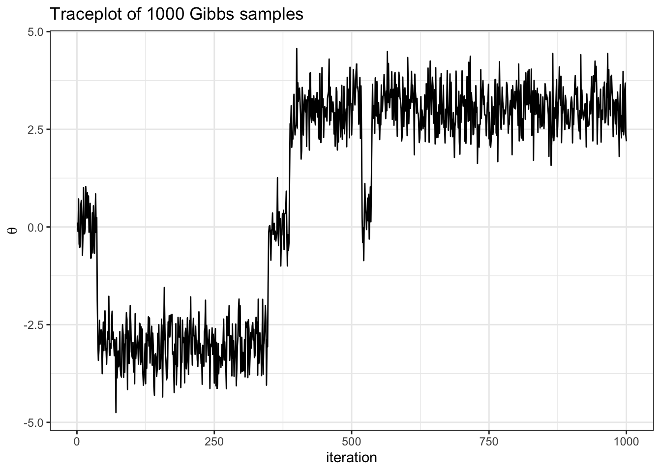 - what do you notice from the traceplot above? Hint: you can imagine hopping from delta islands in the first figure of the joint target over parameter space.
