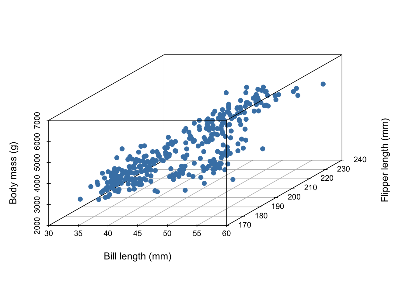 Now, imagine it’s hard to measure a penguin’s bodymass because it’s difficult to get them onto a scale. We wish to develop a linear model that uses bill length and flipper length to predict body mass,