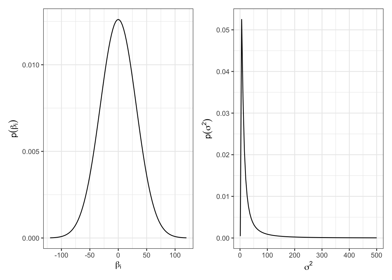 If we know very little about the relationships between \(X\) and \(\mathbf{y}\), we might wish to consider a “diffuse” prior that prescribes a large mass of uncertainty around each parameter.