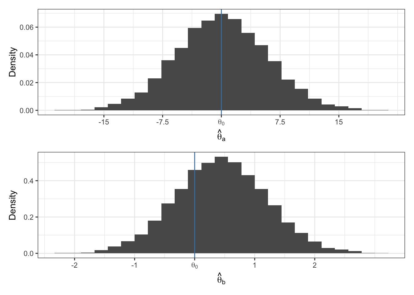 Imagine \(\hat{\theta}_a\) and \(\hat{\theta}_b\) are two different estimators of \(\theta\). The true value of \(\theta\) is \(\theta_0 = 0\). The sampling distributions of the two estimators are given below. Which estimator do you prefer?