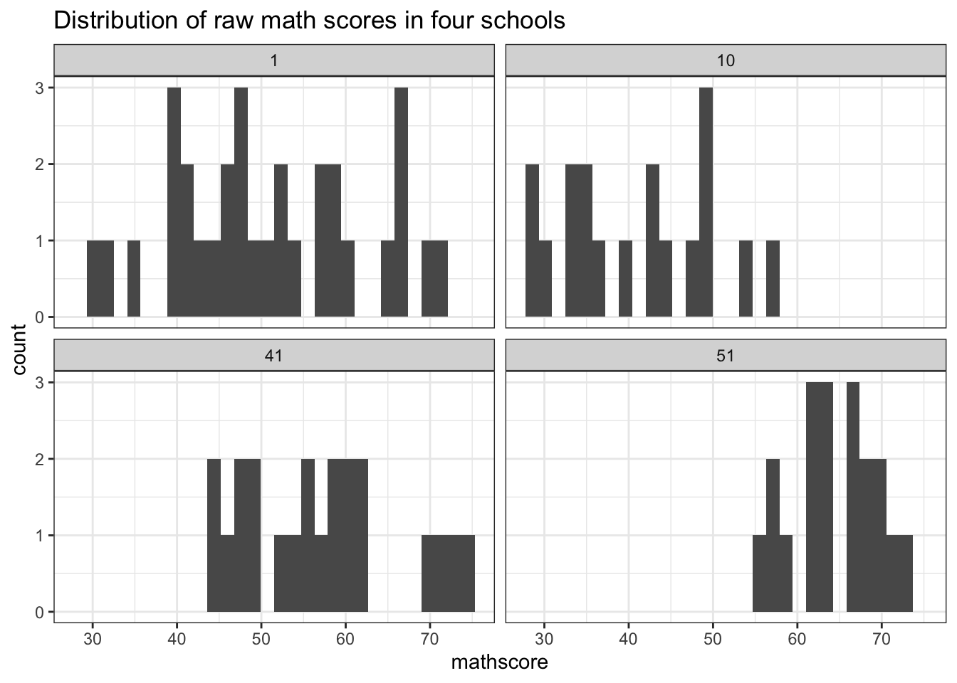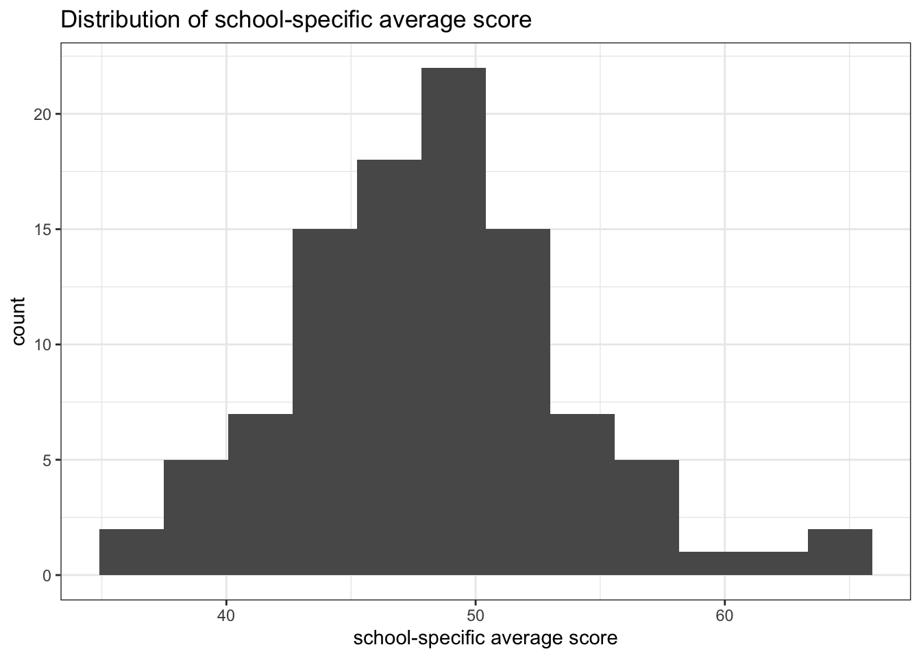 Each year, students across North Carolina take an identical standardized test. In our sample, we observe scores from students at \(m\) different schools. At the \(j\)th school, \(n_j\) students take the exam and \(j \in \{1, \ldots m\}\). The exam is designed to give an average score of 50 on a 0 to 100 scale.